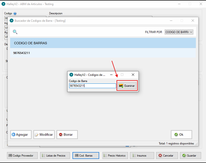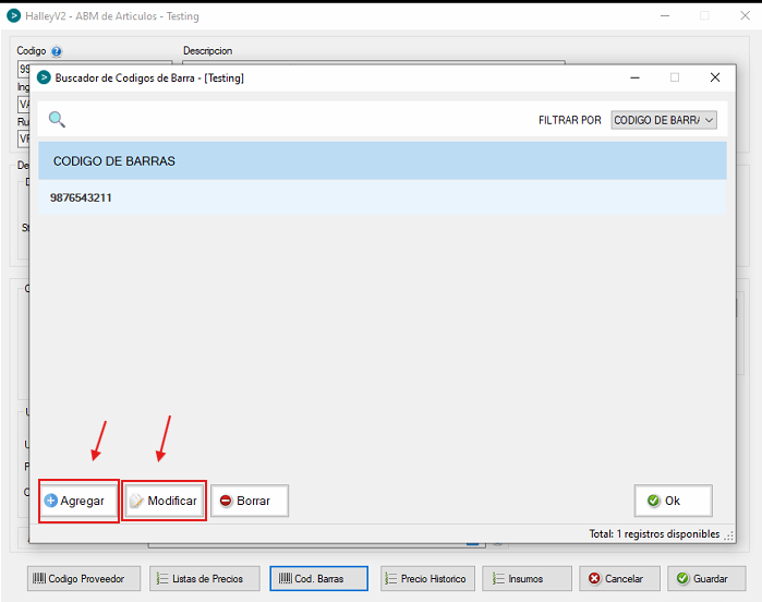 Una vez dentro de la sección de códigos de barra podrás agregar un código o editar nuevamente un código de barras cargado previamente dando clic en "Agregar" o "Modificar" según cada caso.